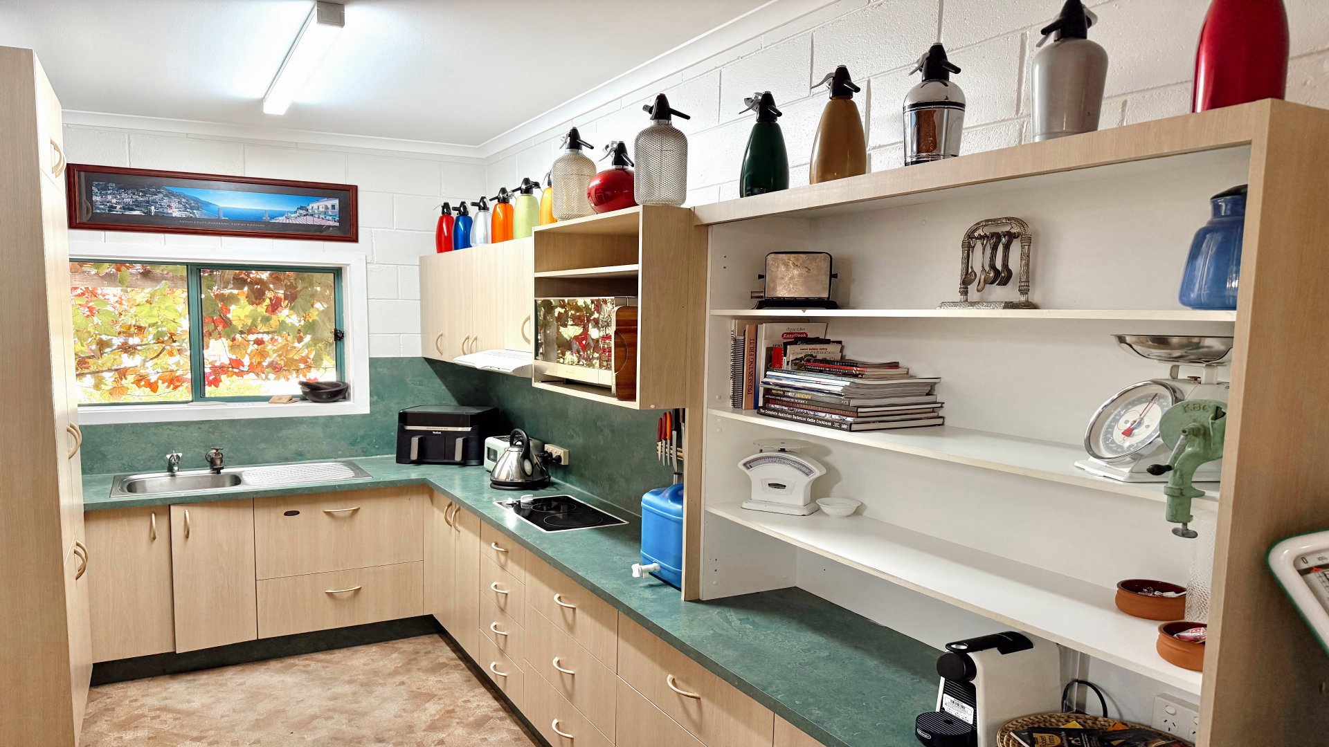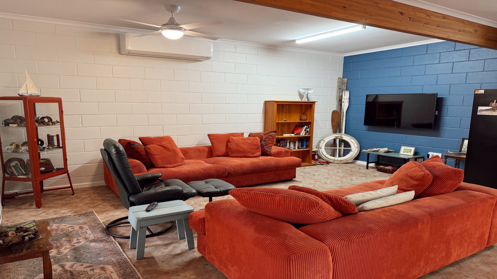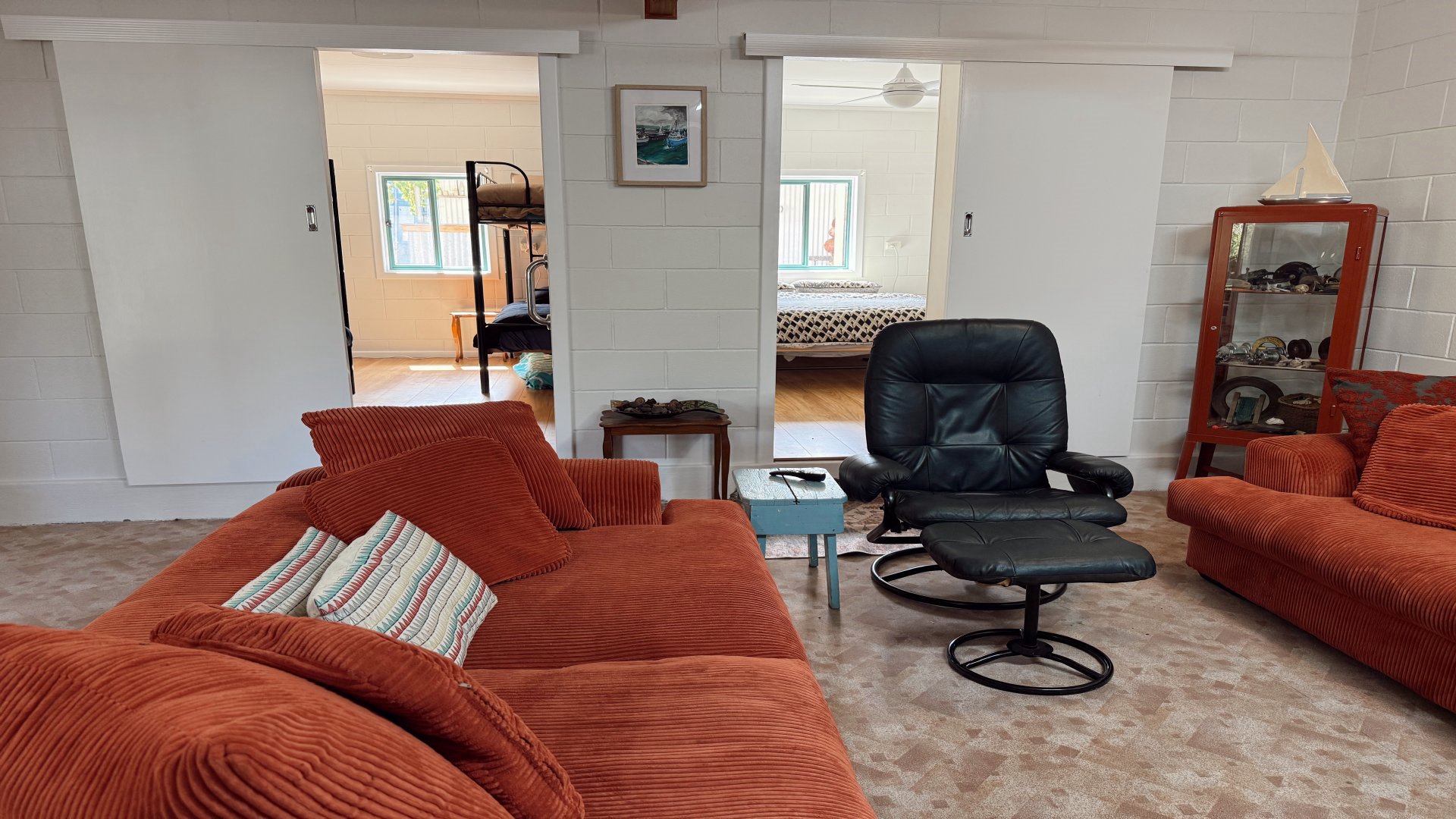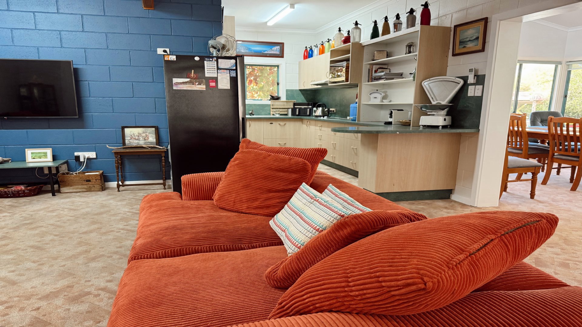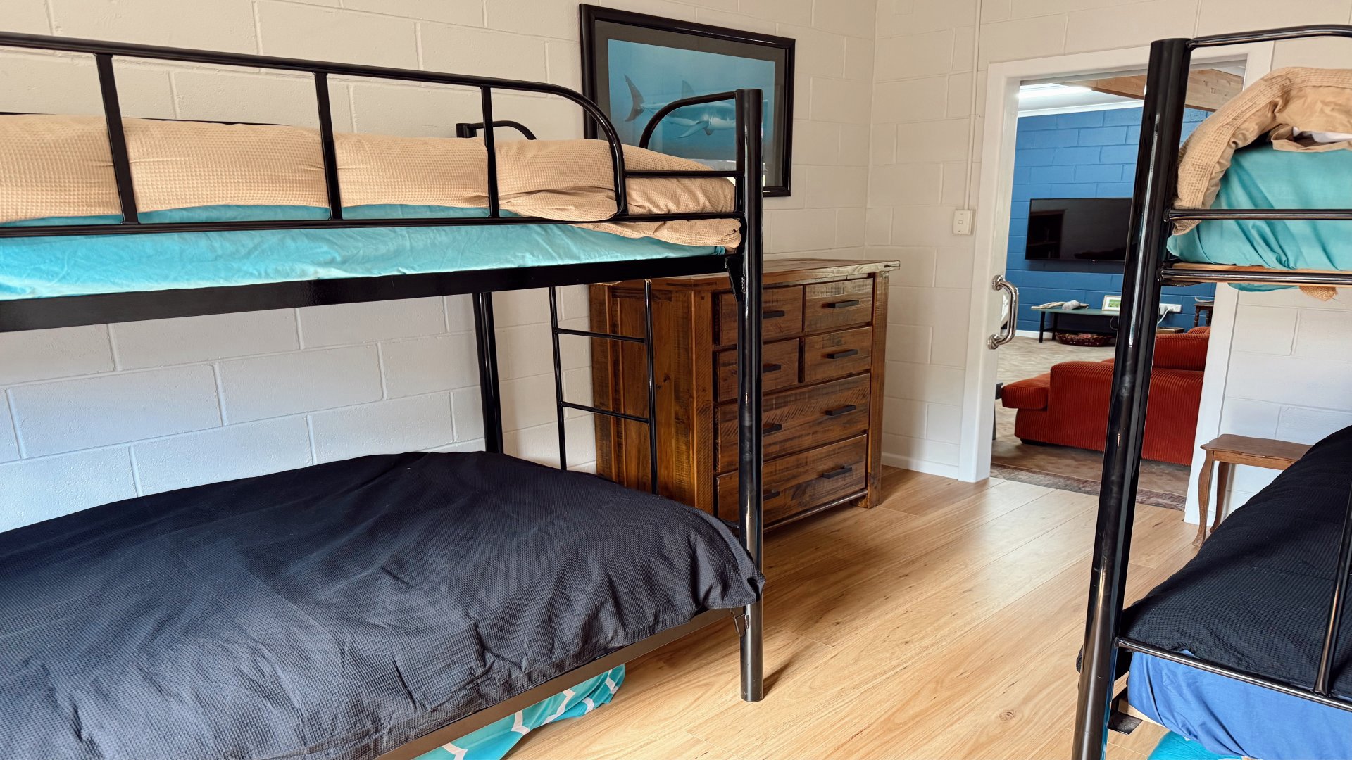 Sleeping up to 8 guests, the home features a king bed, a queen bed, and two sets of bunks - ideal for families or groups. The retro-inspired kitchen is fully equipped with everything from a DeLonghi pod coffee machine to an air fryer, making it easy to settle in and feel right at home. A central bathroom, with a toilet and washing machine, adds convenience, while air conditioning and ceiling fans throughout keep things comfortable year round.