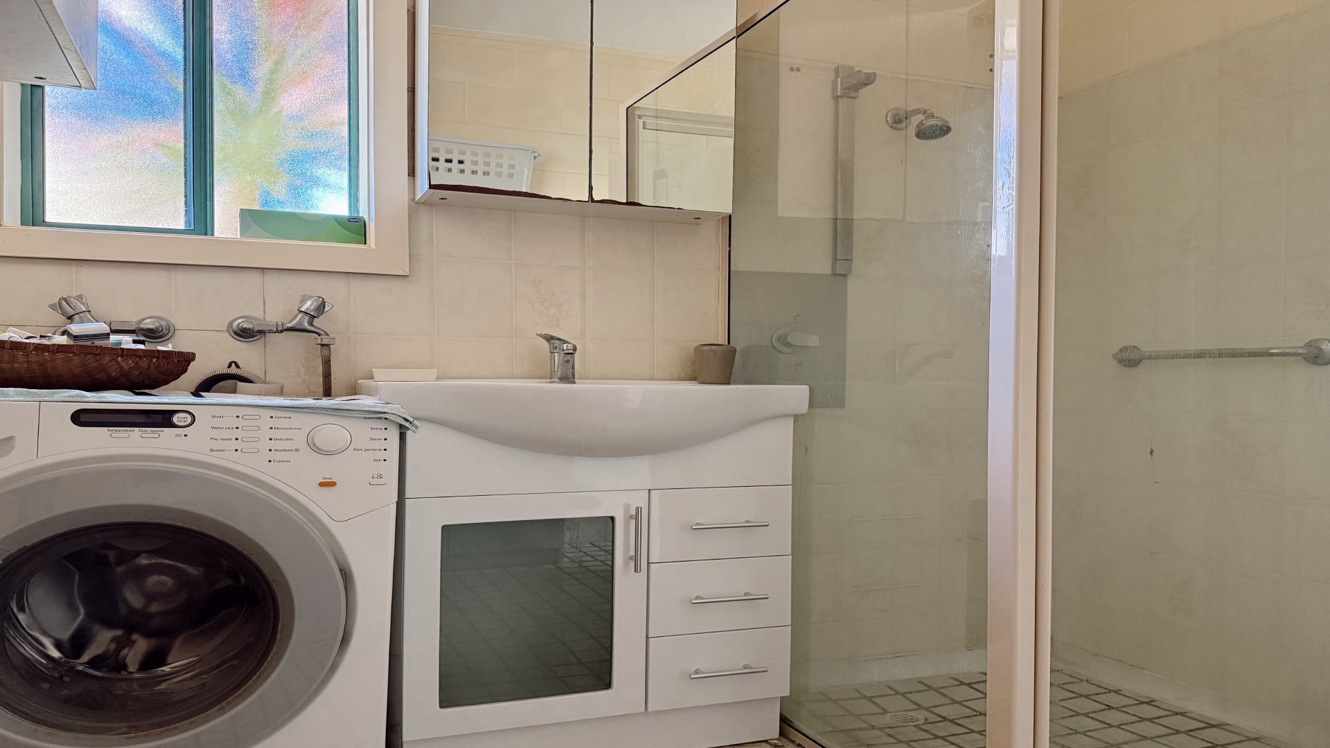 Bathroom has a shower, toilet, vanity and washing machine